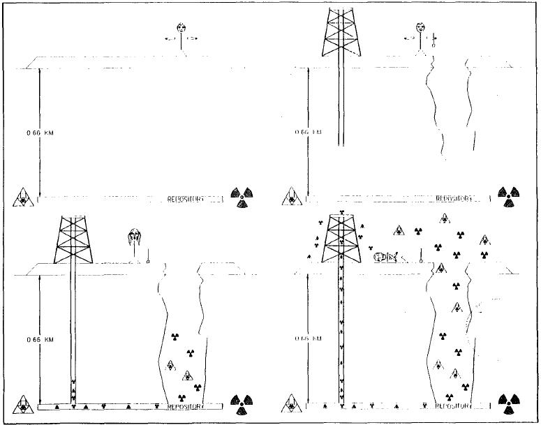 Below is another amazing image from the early concepts. I remember this one from the presenation, even though it was almost 15 years ago. It’s haunting. It’s a little hard to see, but there’s a person, unknowningly standing above the repository. In the second panel, there’s drilling. In the third panel, the drilling has reached the repository, contaimination is rising to the surface and the guy looks upset. In the last panel contamination is everywhere and the guy is dead.