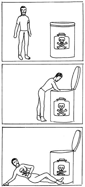 These images show some early examples of attempts to define, in pictographs, the symbols for Poison and Radioactive. It’s pretty fascinating. In the depiction of the symbol for poison (at left), the happy person opens the container and looks in, and quickly becomes ill. In the depiction for radioactive (at right), the happy person is near the radioactive material, which, over time, begins to contaminate him, though he still looks happy because he’s blissfully unaware of his condition, and eventually he becomes ill as well. The growth of the tree indicates that time is passing more slowly in this case.