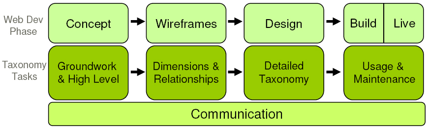 Here’s a diagram I created to show how taxonomy building tasks should be integrated with the phases of a web development process. Communication with the stakeholders should be taking place throughout the project lifecycle. What’s the goal? Getting the following things from the stakeholders: